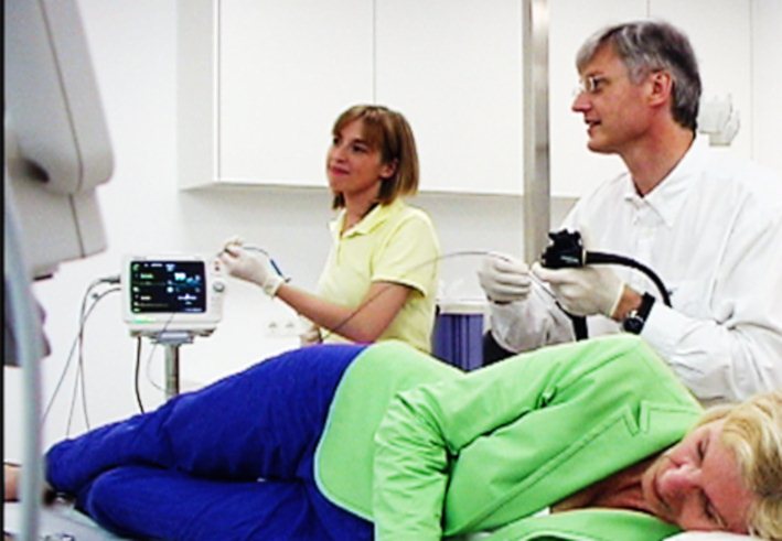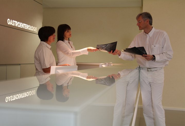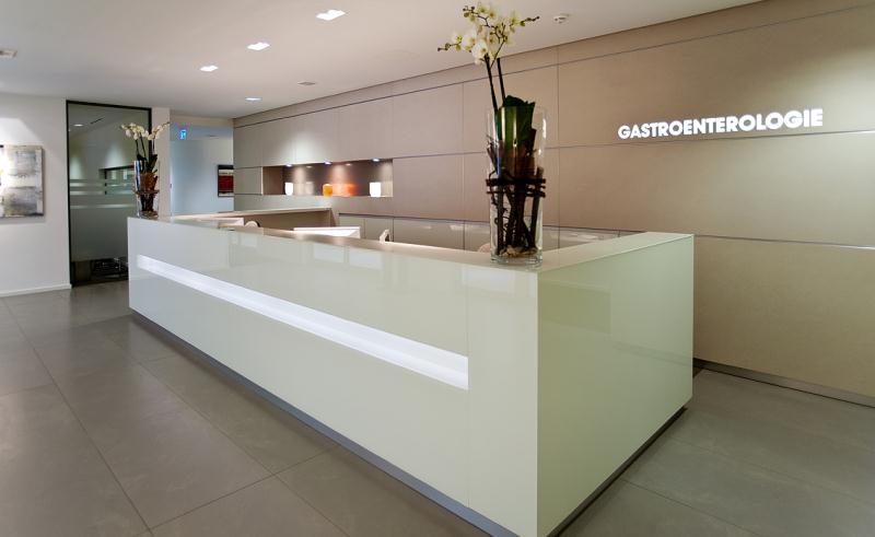 Schwerpunktpraxis für Gastroenterologie Anmeldung Gastroskopie - Magenspiegelung Ultraschall Koloskopie - Darmspiegelung Außenansicht Außeneingang Anmeldung Wartezimmer Wartezimmer Frühstücksraum Flur Sprechzimmer Ruheraum Endoskopieraum Endoskopieraum